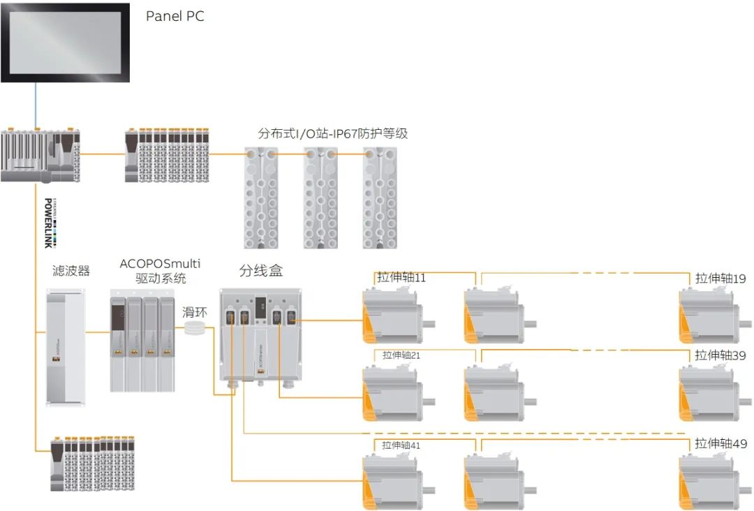 整個(gè)貝加萊旋轉(zhuǎn)吹瓶系統(tǒng)的架構(gòu)如圖5所示,通過(guò)POWERLINK網(wǎng)絡(luò),達(dá)到百微秒級(jí)的任務(wù)刷新,ACOPOSmotor、X67的模塊均可在現(xiàn)場(chǎng)安裝,并達(dá)到IP65防護(hù)等級(jí),適合于啤酒飲料等生產(chǎn)現(xiàn)場(chǎng),并且,ACOPOSmotor還支持“單電纜技術(shù)”—接線方便且成本低。